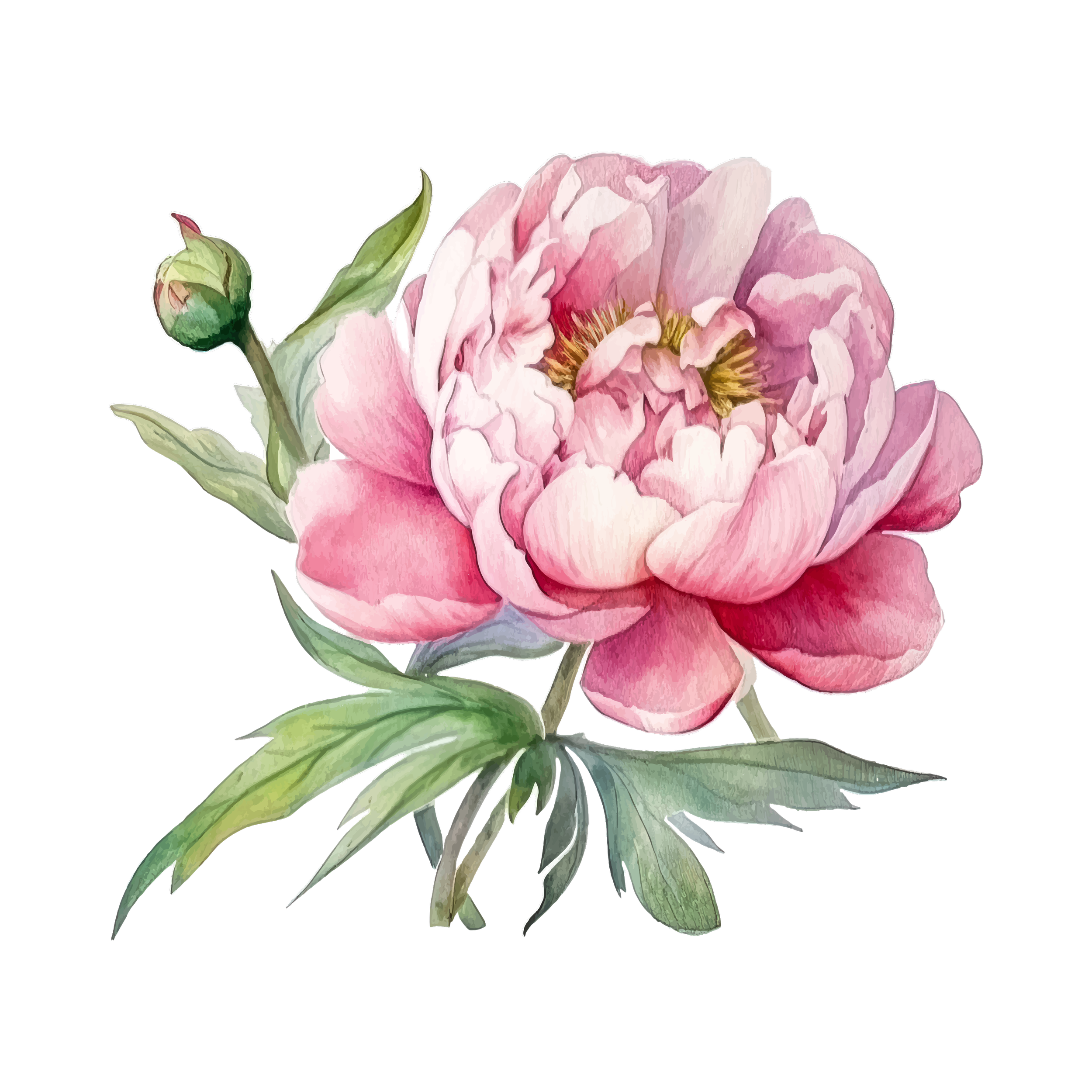 Watercolor painting of a pink peony with green leaves and buds on black background.